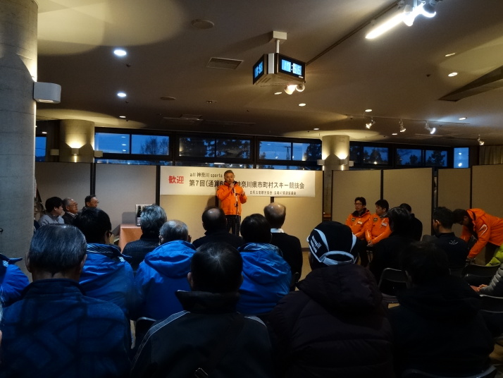 白馬五竜スキー場のエスカルプラザにて、17時より各市町村スキー協会の団長・監督・コーチが集まり、回転競技、大回転競技やクロカン競技の概要(コース・時間等)についての説明がありました。終了後、開会式が始まり、(公財)神奈川県スキー連盟の役員及び地元白馬五竜観光協会、索道会社、スキースクールの役員が列席され、県内の市町村スキー協会の会長、監督・コーチらが一堂に会して、神奈川県スキー連盟の司会進行で始まり、主催する(公財)神奈川県スキー連盟の片忠夫会長の挨拶、白馬五竜観光協会の矢口会長挨拶及び大会役員の紹介のあと、昨年優勝チームの相模原市より優勝旗返還及び、選手宣誓が行われました。そのあと場所を移しての関係者による懇親会が始まりました。2時間ほどで終了し、それぞれの宿舎に戻り、明日からの競技に専念することとなりました。